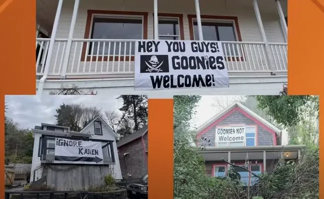 A fan of the movie ‘The Goonies” recently bought the Goonies house in Astoria, Oregon. He doesn’t care if fans of the movie stop by and see the house. However, a neighbor on the street does care. The house in the middle of those two is just along for the ride.
