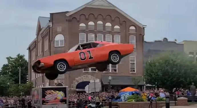 A stuntman jumped over a fountain in Somerset, Kentucky in a replica of The Dukes of Hazzard’s General Lee.