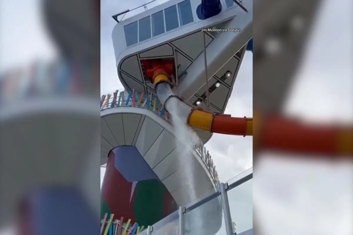 The ship’s “Frightening Bolt” slide, which promises a 46-foot drop and a 360° loop, lived up to its name and added another drop to it as the “glass” (acrylic) snapped, sending water and one guest plummeting to the deck. The person who fell out is still in one piece and was being treated by the ship’s medical team as other panicked guests screamed “stop the slide!”