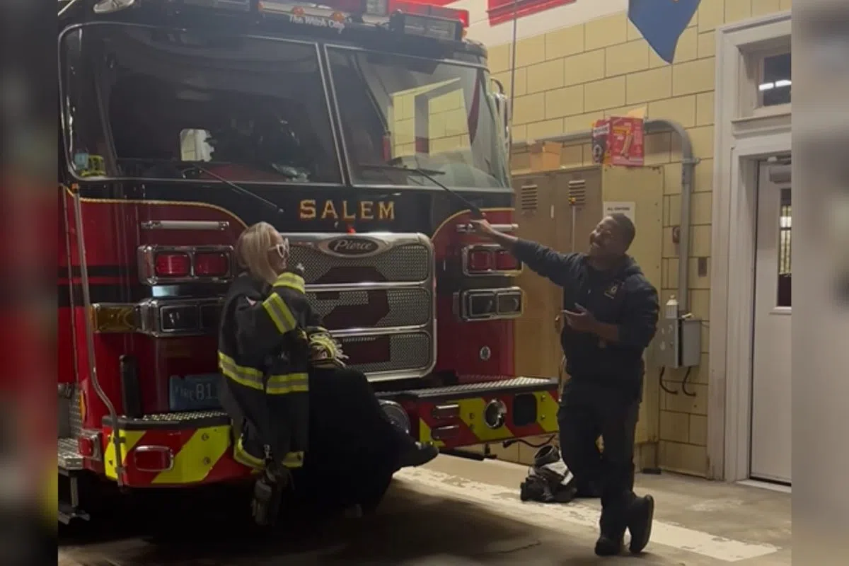 Salem Fire Department’s Kenny Tejeda sang Mario’s ‘Let Me Love You’ to the bride as she wore a firefighter jacket with her heart-shaped glasses and he had the other ladies joining in!