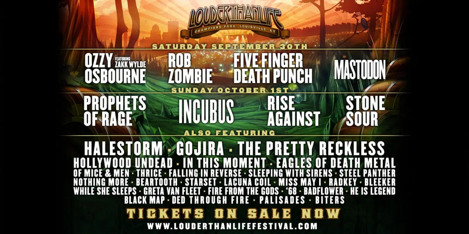 The 2017 lineup for Louder Than Life includes Ozzy Osbourne with Zakk Wylde, Five Finger Death Punch, Rob Zombie, Prophets of Rage, Incubus, Rise Against, Stone Sour, Halestorm, The Pretty Reckless, Thrice, Nothing More, Greta Van Fleet, and MORE! For the entire lineup and mor info, visit LouderThanLifeFestival.com.