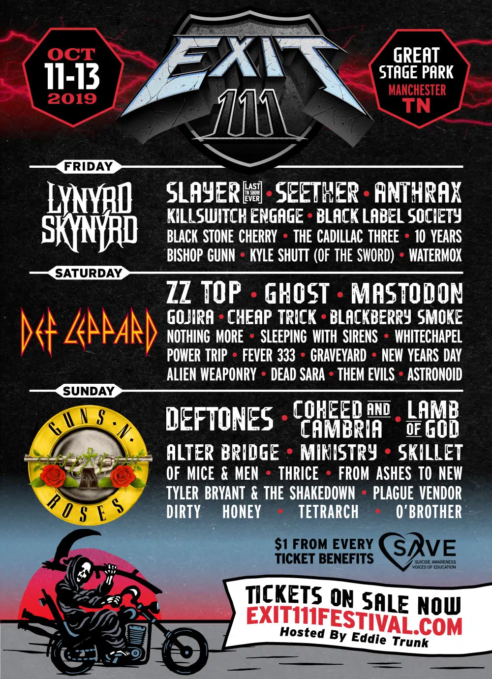 EXIT 111 Festival will debut with a heavyweight line-up that celebrates all forms of rock--from hard to classic, alternative to southern--when it debuts October 11-13 at the Great Stage Park in Manchester, TN. The inaugural three-day event hosted by Eddie Trunk will be led by headlining slots from Guns N’ Roses, Def Leppard, Lynyrd Skynyrd, and a mix of platinum-selling artists including Slayer (in the last Tennessee show of their career), ZZ Top, Deftones, Ghost, Megadeth and more than 40 acts (full line-up below). Tickets for EXIT 111 go on sale Thursday, April 25 at 12:00 PM (ET), with additional ticketing info below.
