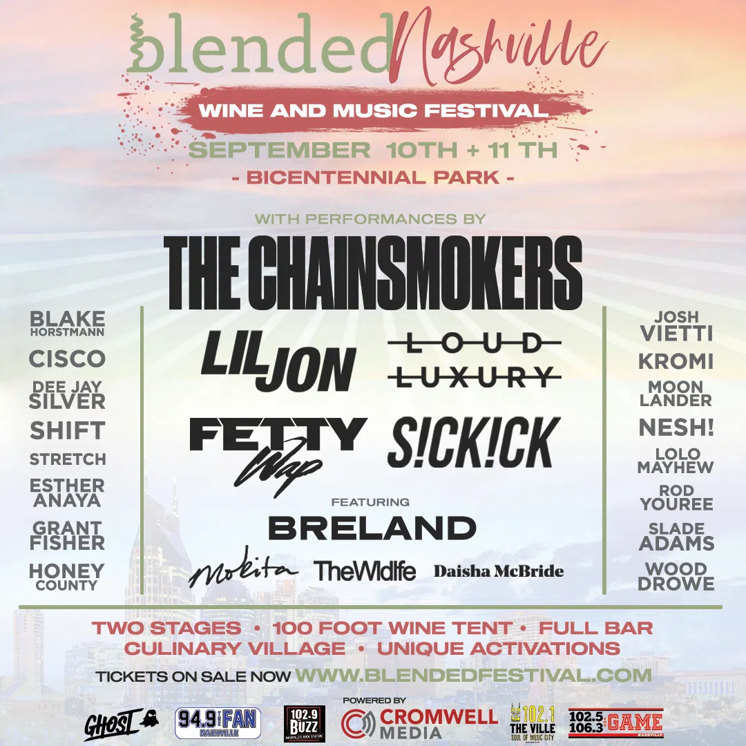 This September, The Chainsmokers hit Music City at the BLENDED WINE AND MUSIC FESTIVAL. Tickets are on sale now! 24 bands, 2 stages, 1 weekend all under the Nashville skyline! Performances by THE CHAINSMOKERS, LOUD LUXURY, SICKICK, FETTY WAP, BRELAND and many more! September 10th and 11th the ULTIMATE SOCIAL EXPERIENCE drops in Music City. Enjoy a massive 100-foot wine tent, culinary village, and wellness lounge. Tickets available NOW at BlendedFestival.com!