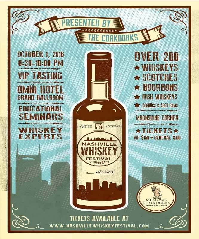 Midtown Corkdorks Wine, Spirits, Beer is thrilled to present the 5th annual Nashville Whiskey Festival, a celebration devoted to the exploration of whiskey from around the world and throughout the centuries. With distilleries from all over the world pouring from their finest barrels, it’s no wonder that spirits enthusiasts will be traveling from all over the country to attend the 2016 Nashville Whiskey Festival. The Festival will be held at the Omni Nashville Hotel Grand Ballroom: one of the finest event spaces in town with over 20,000 square feet of available space and unparalleled views of the Nashville skyline!
