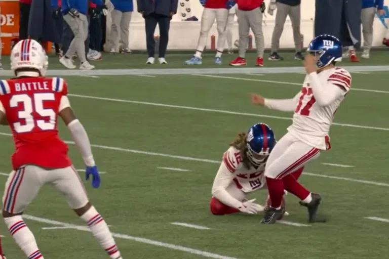 A young Younghoe Koo of the New York Giants squared up for what seemed like a routine, 46-yard kick against the New England Patriots. However, he must have watched a lot of "A Charlie Brown Thanksgiving" over the holiday as he somehow manages to absolutely whiff, not the kick, but the ball. Instead of sending...